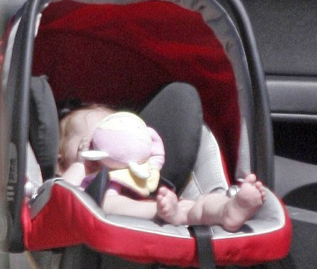 Peekaboo: The baby, believed to be Cristiano Ronaldo's new son, is carried from the Algarve to their family home in Lisbon today