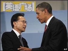 八国集团的声明说,他们谴责导致韩国天安舰沉没、46人丧生的攻击行动。朝鲜否认发动了针对天安舰的攻击行动。但一个国际调查小组认为,是朝鲜发射的鱼雷击沉了天安舰。八国集团的声明要求朝鲜克制,不再对韩国进行任何攻击或挑衅行动。上图为奥巴马和韩国总统李明博。